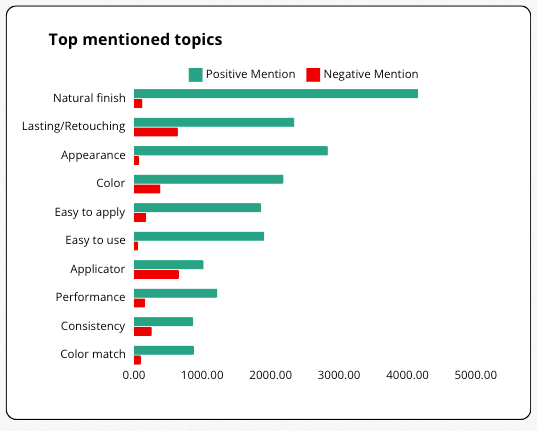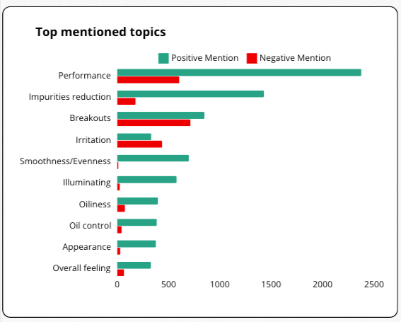 Based on our analysis, while Performance is one of the product's most positively mentioned aspects, Breakout and Irritation are its top negatively mentioned features, especially when these are associated with a lack of visible results.