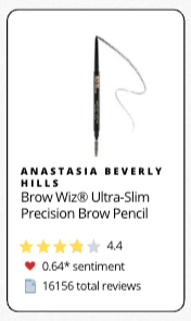 The Brow Wiz® Ultra-Slim Precision Brow Pencil is praised all over the web, with an average rating of 4.4 stars among over 16,156 reviews globally! The customer sentiment index performs decently (0.64), meaning consumers perceive this product positively overall. ABH's 'award-winning' product gives natural results and stays long on the skin. But there is one fatal flaw: the fragile brush.