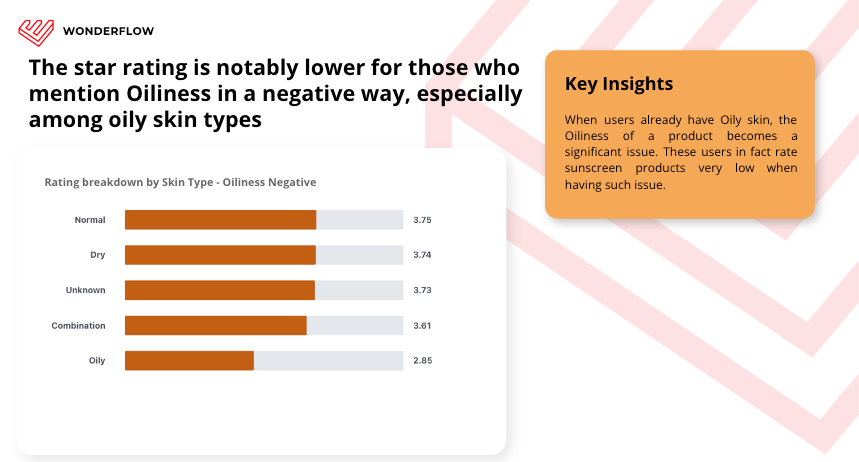 Finding the perfect sunscreen is often a challenge for consumers with oily skin. Our findings reveal that when a product exacerbates oiliness, it quickly becomes a dealbreaker, leading to low ratings. Oiliness is a recurring pain point, especially for those who experience shine after application.